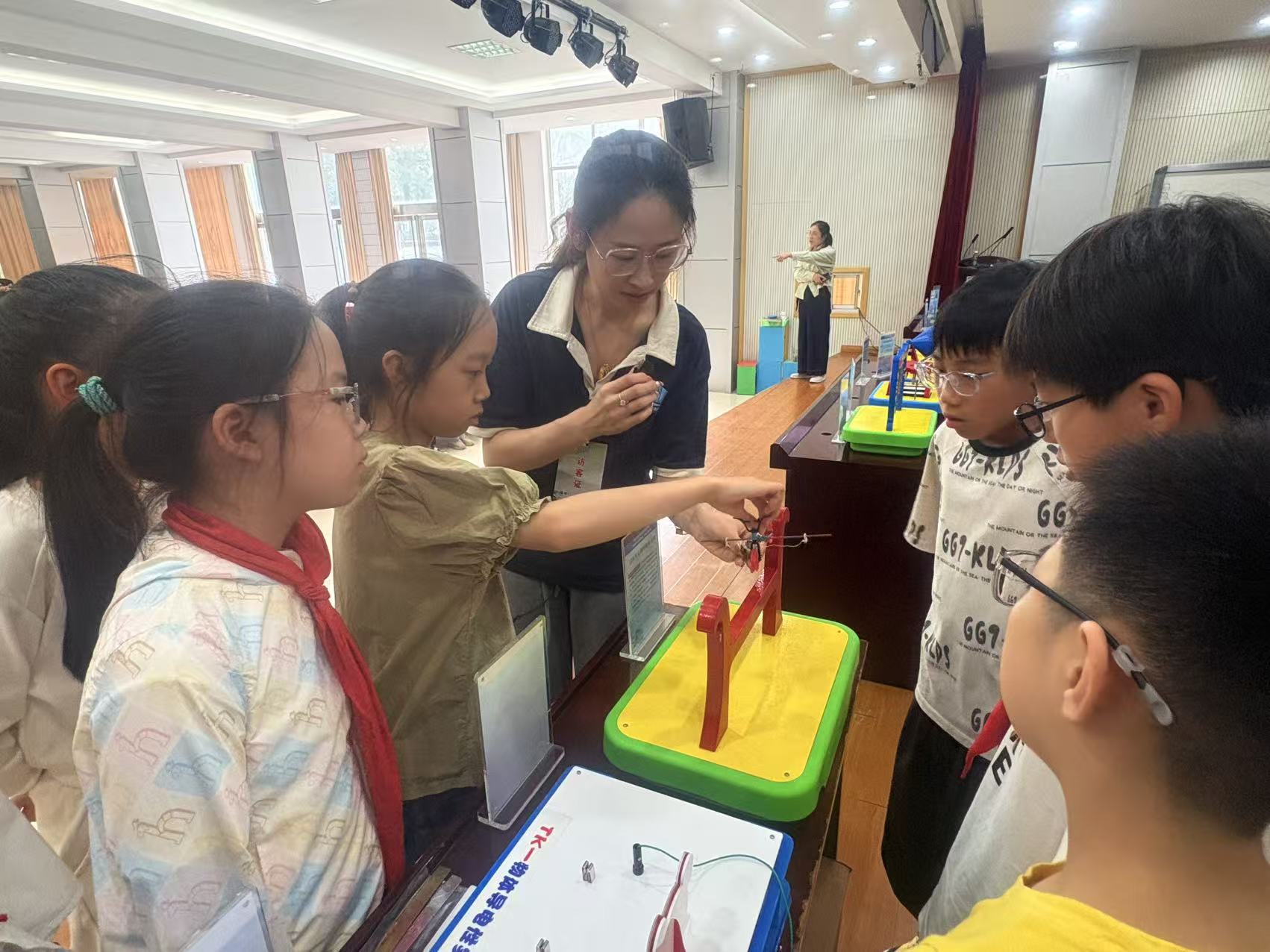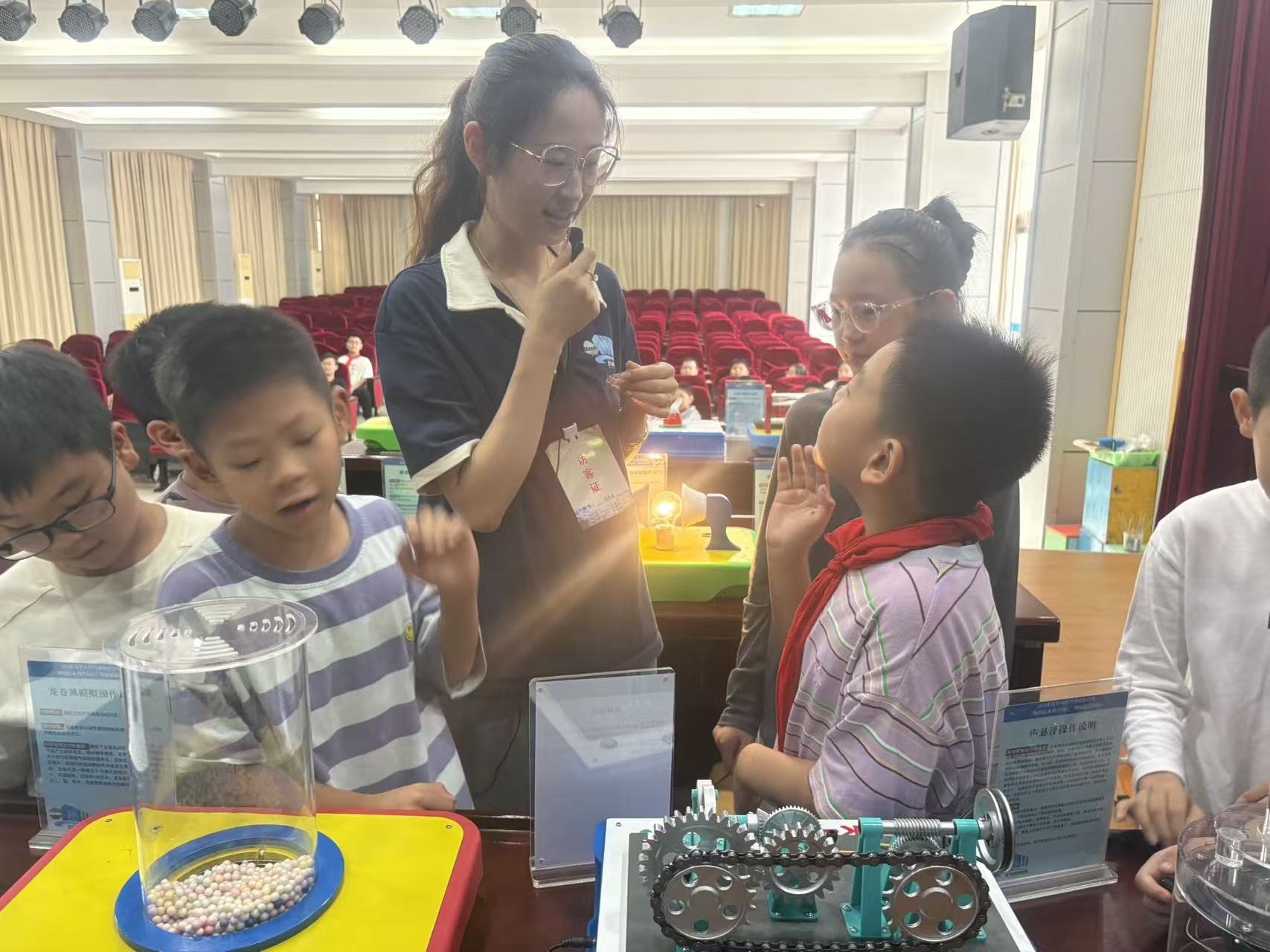 活动现场,30件互动性强、趣味性足的科技微展品整齐陈列,涵盖力学、光学、声学等多个科学领域。“神奇的传声筒”让孩子们在你呼我应中探索声音传播的奥秘,“齿轮转转转”通过可动手调节的齿轮组,直观展现机械传动的原理,“光影魔术手”则利用镜面反射制造出奇妙的视觉幻象,引得同学们纷纷驻足尝试。科技辅导员化身“科学向导”,一边指导孩子们操作展品,一边用通俗易懂的语言讲解背后的科学知识,将抽象的原理转化为生动的体验,现场充满了欢声笑语与求知热情。